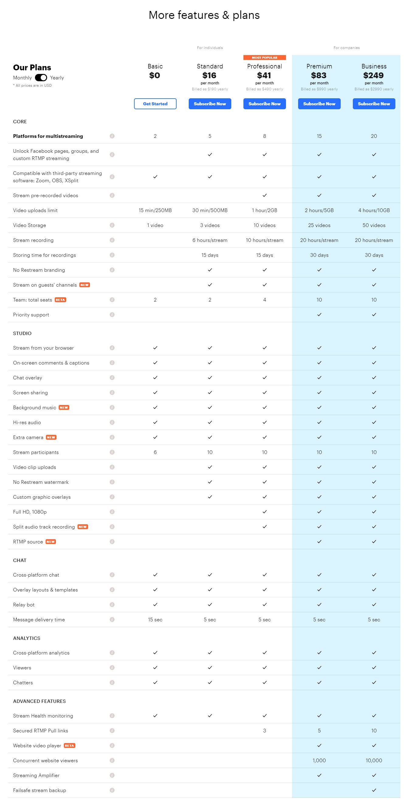 Restream.io, kullanıcılara ücretsiz deneme sürümü (kısıtlı özellikler ile) sunar, kurumsal deneme sürümü ihtiyaçlarınız için bize ulaşabilirsiniz.