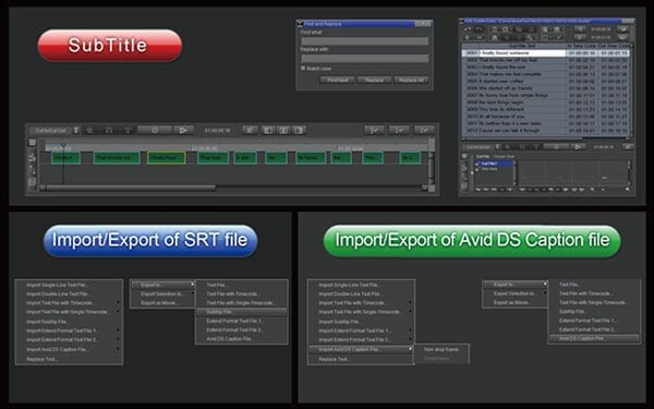• SRT dosyası ve Avid DS Caption dosyasının içe / dışa aktarılması.
